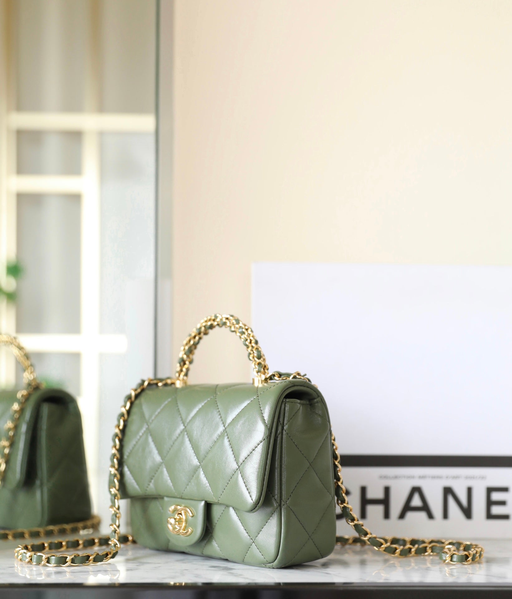 24b mini flap bag 19cm top handle green lambskin