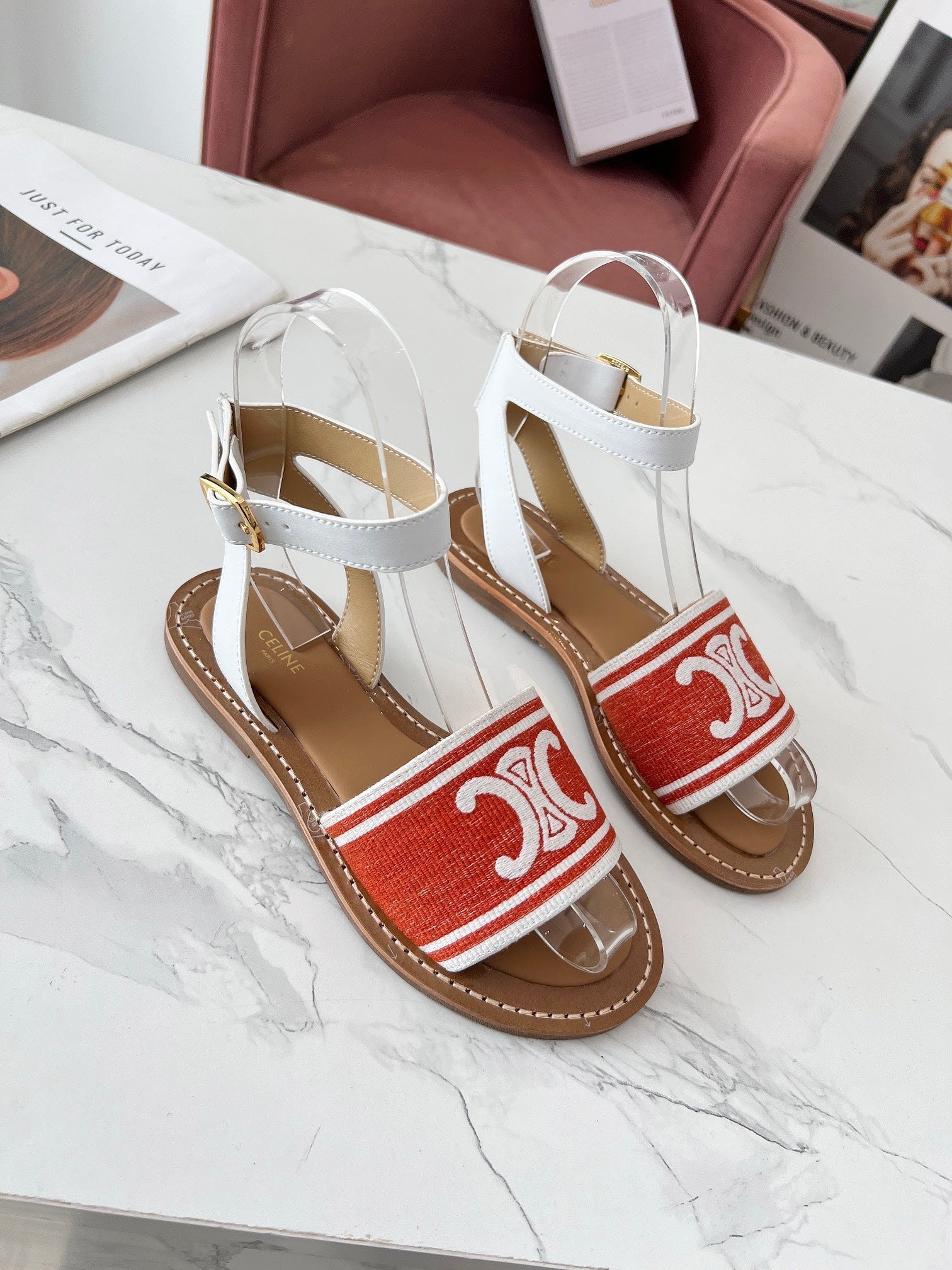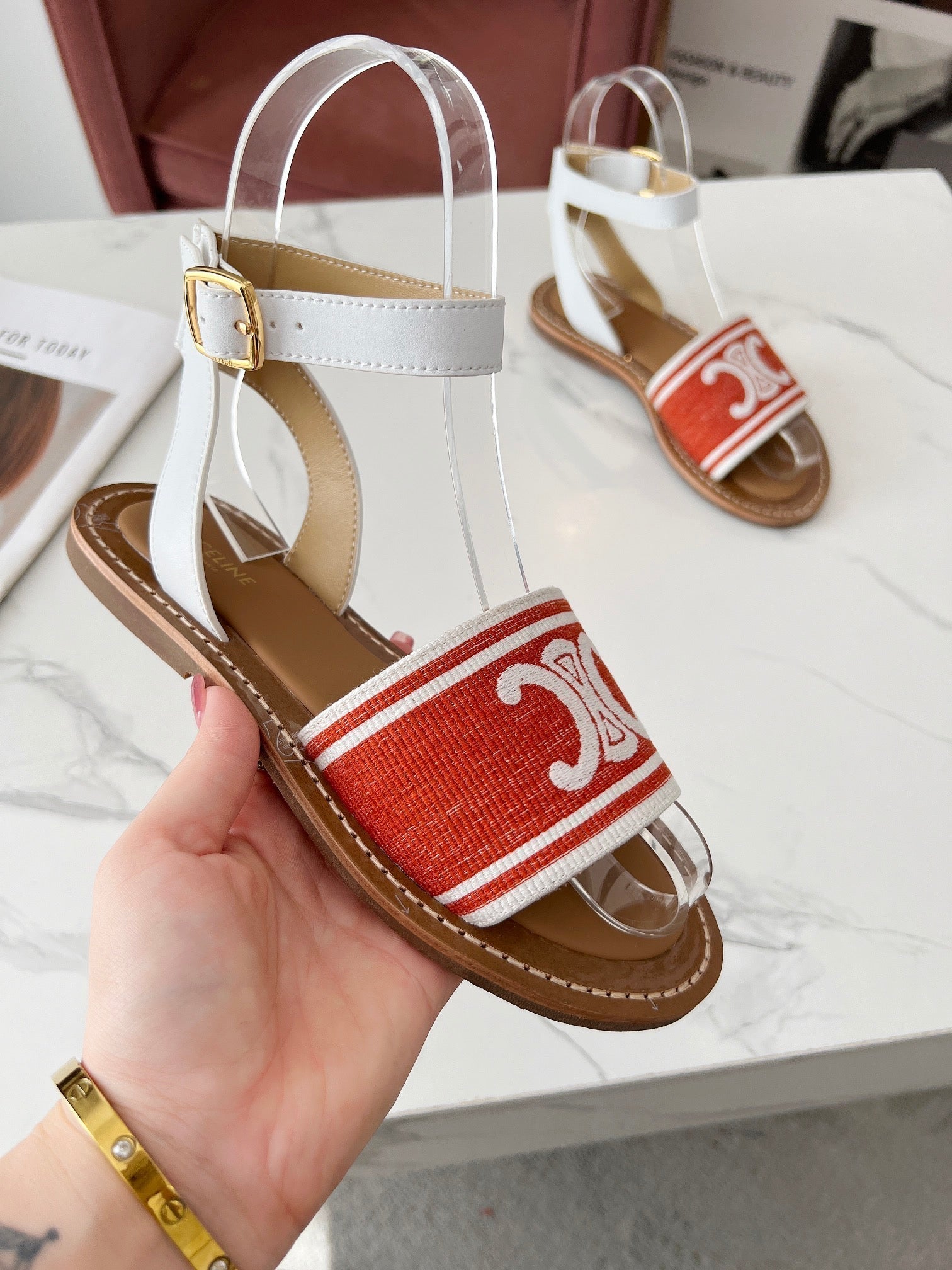 Celine 25C Lympia Sandal Red mix White Canvas with Calfskin 238173