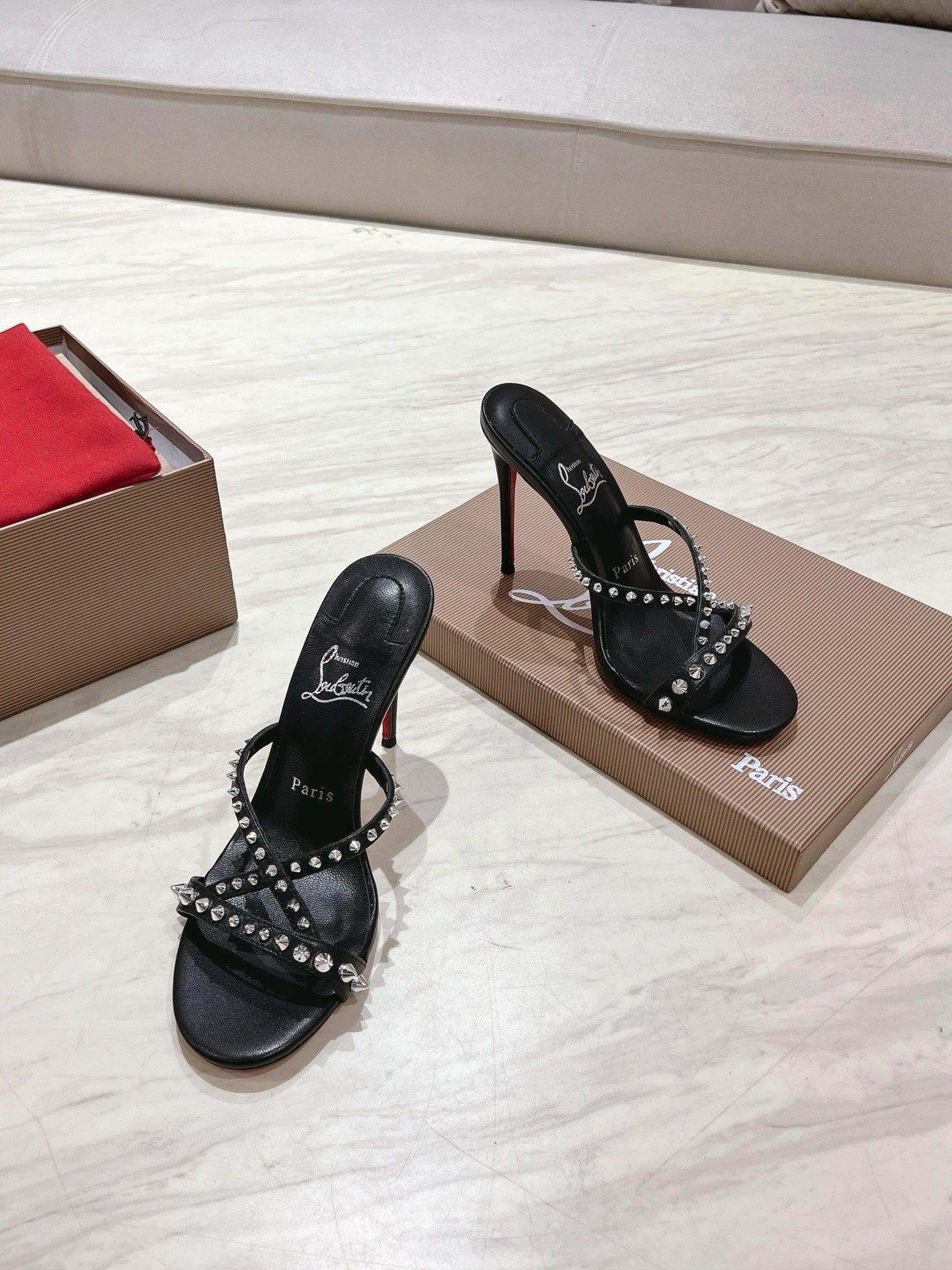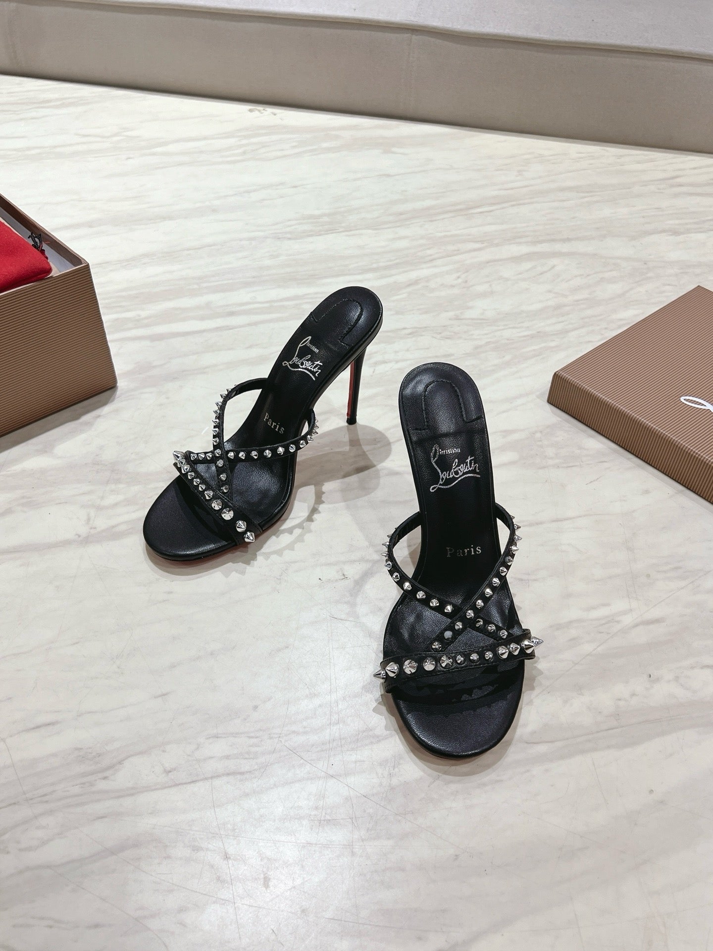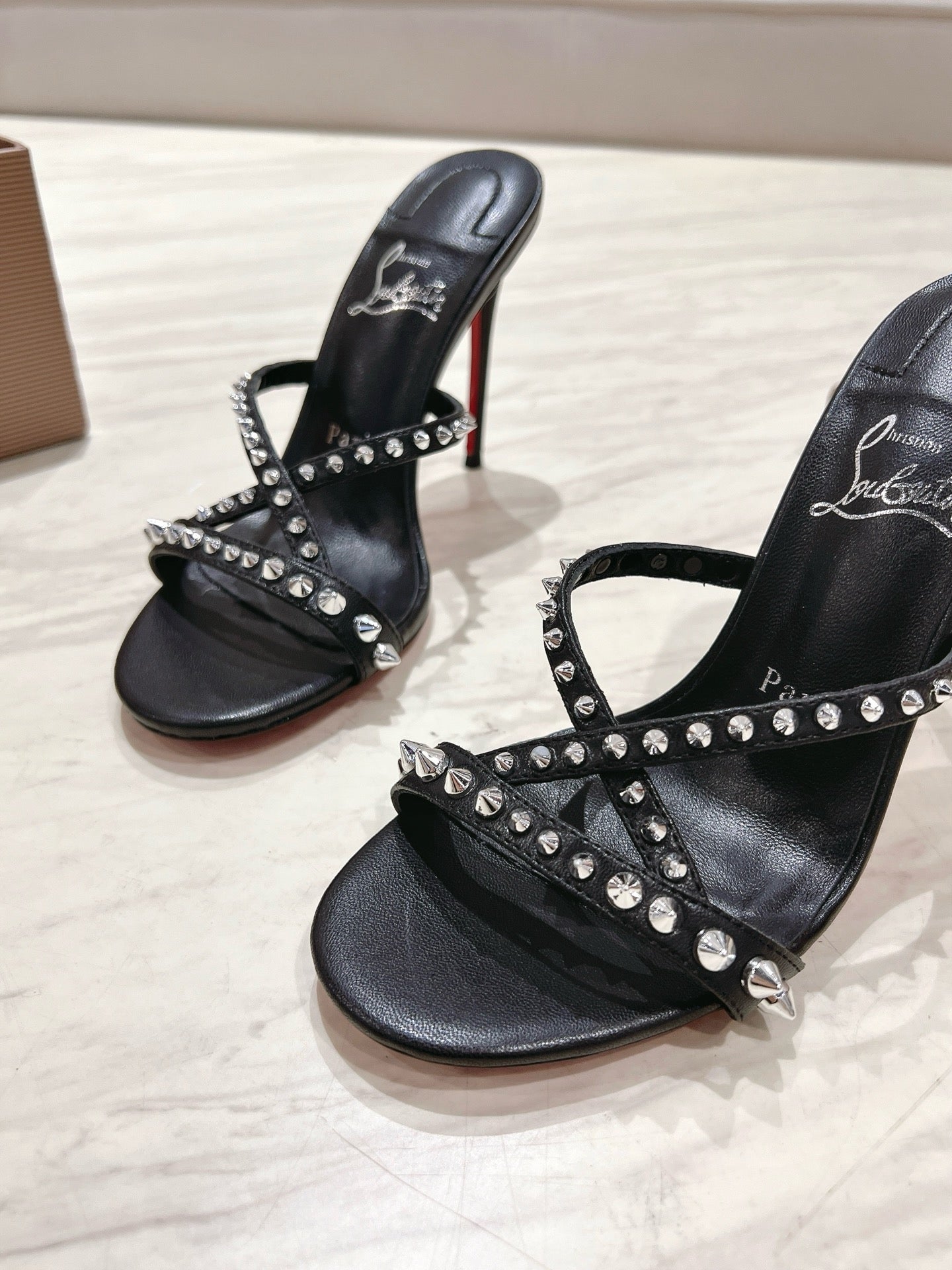 CL 25 Cross-Strap Slippers Black Gloss Calf Patent Leather Rivets 314925
