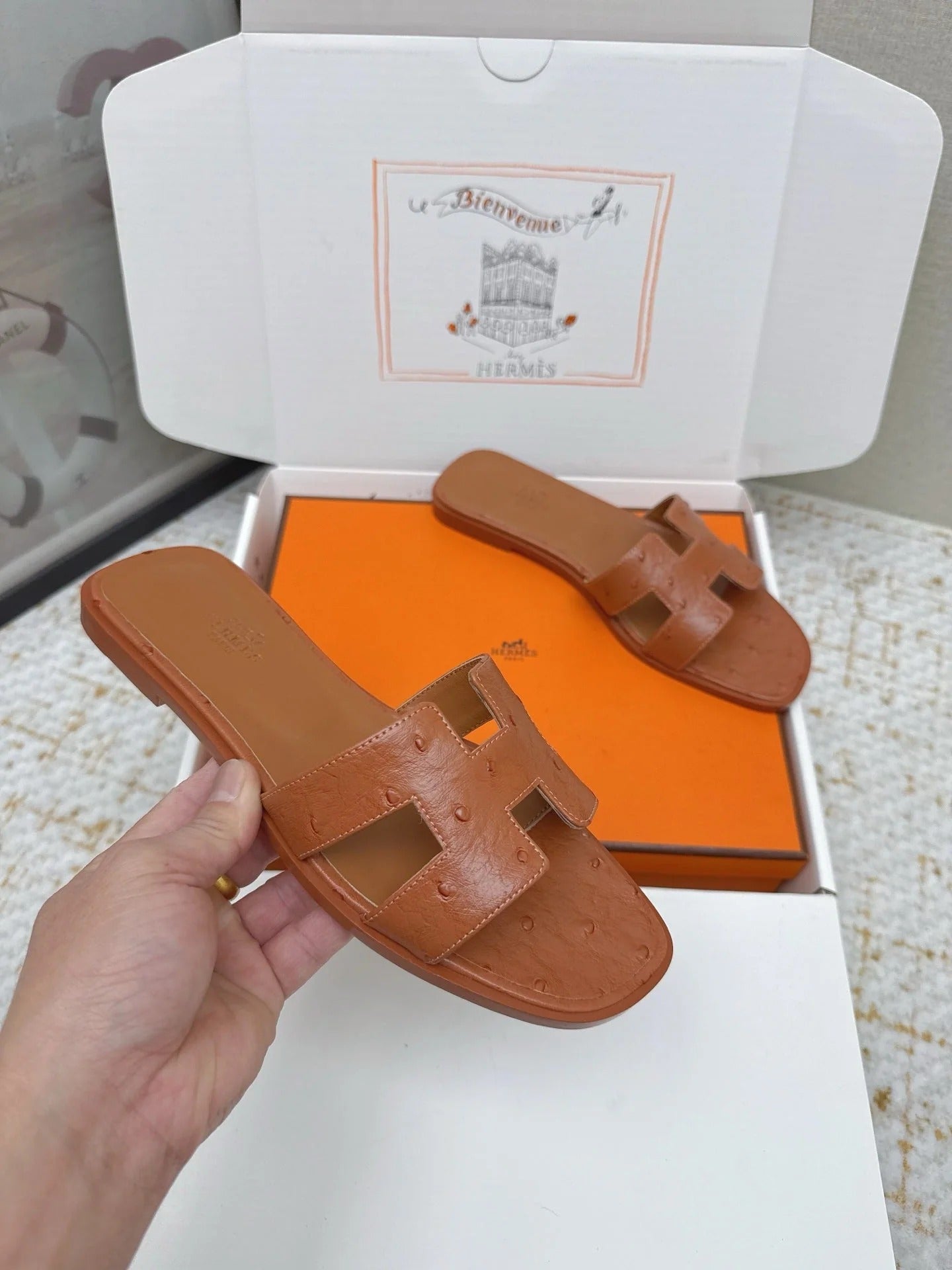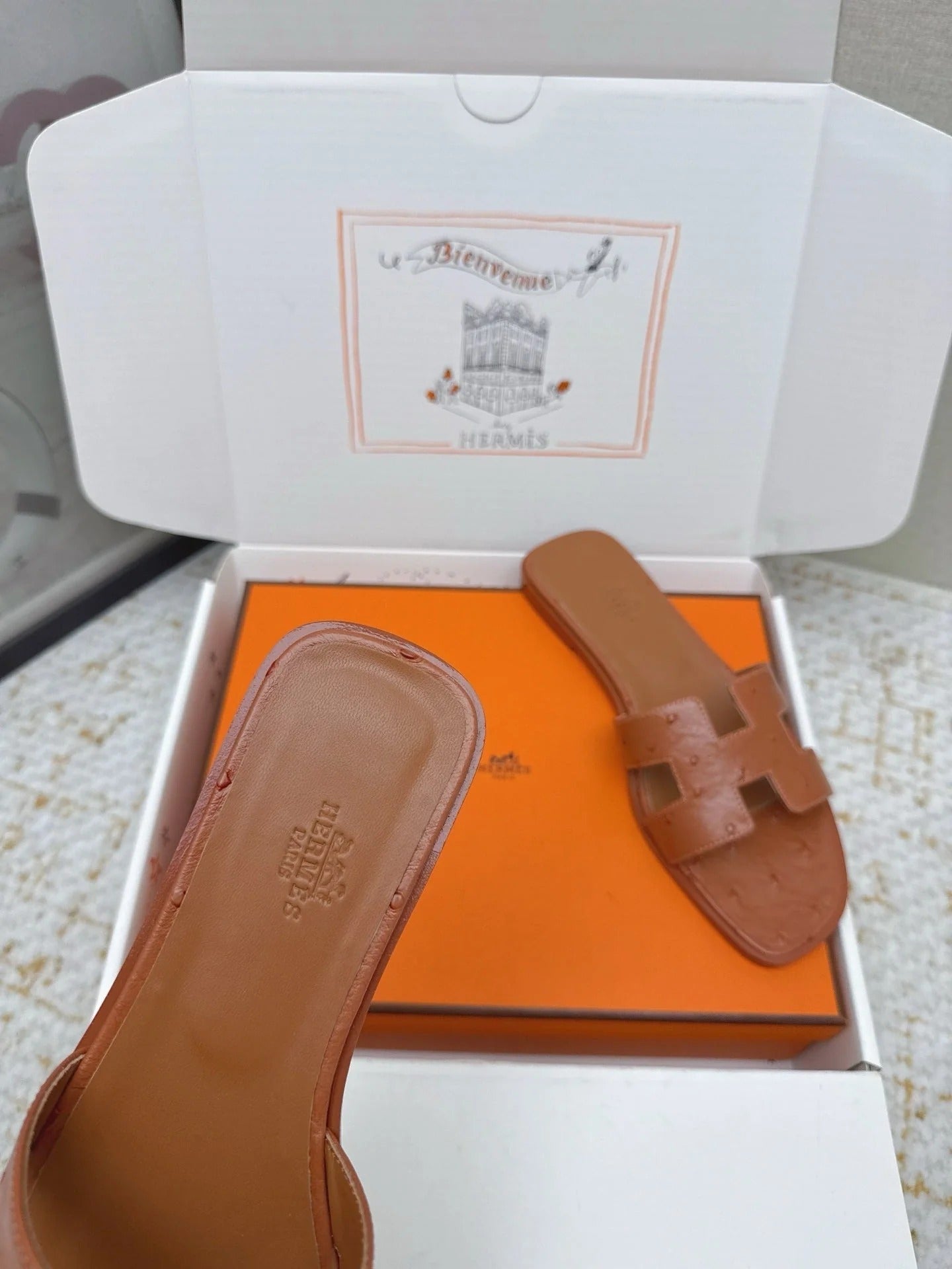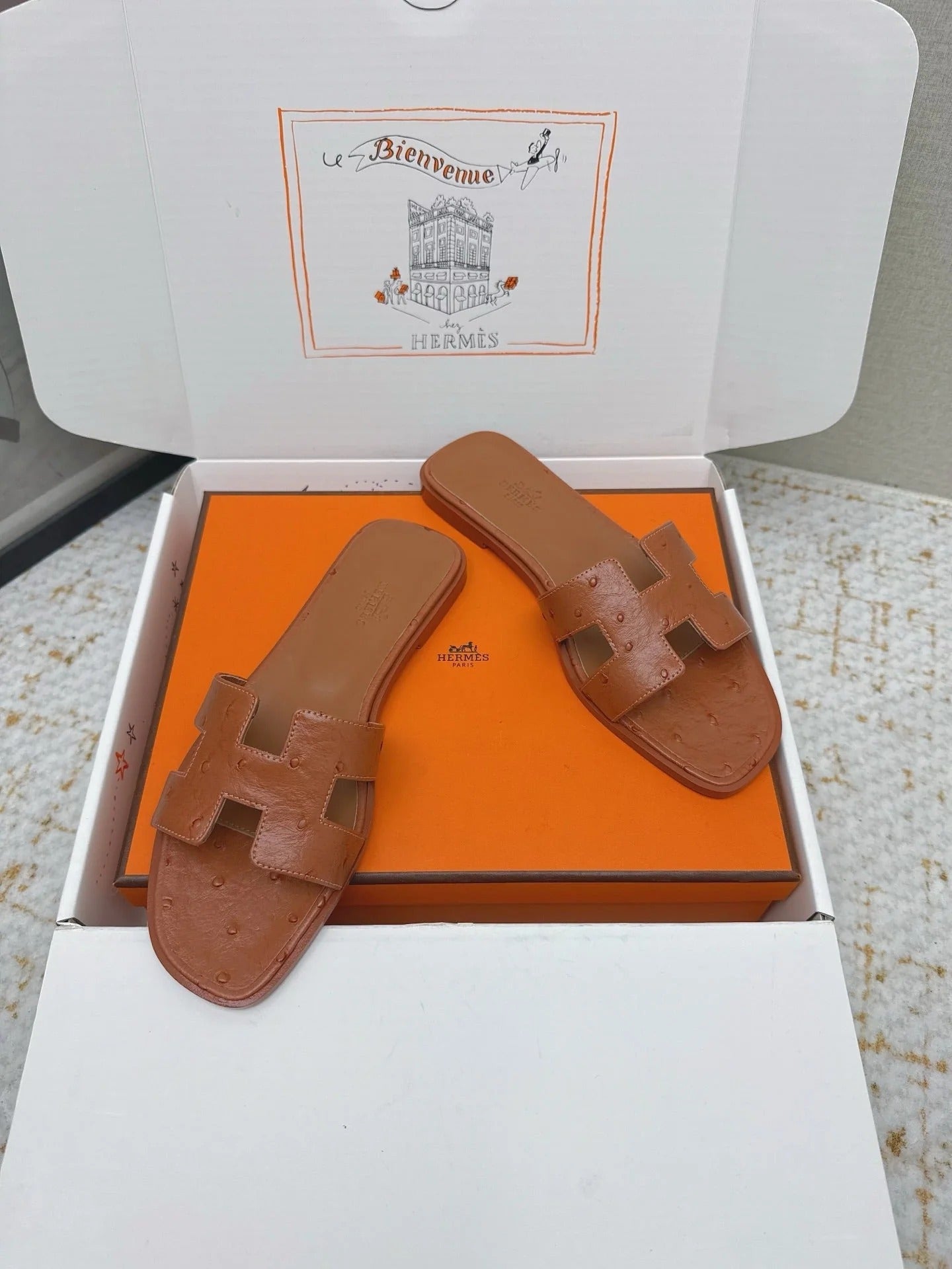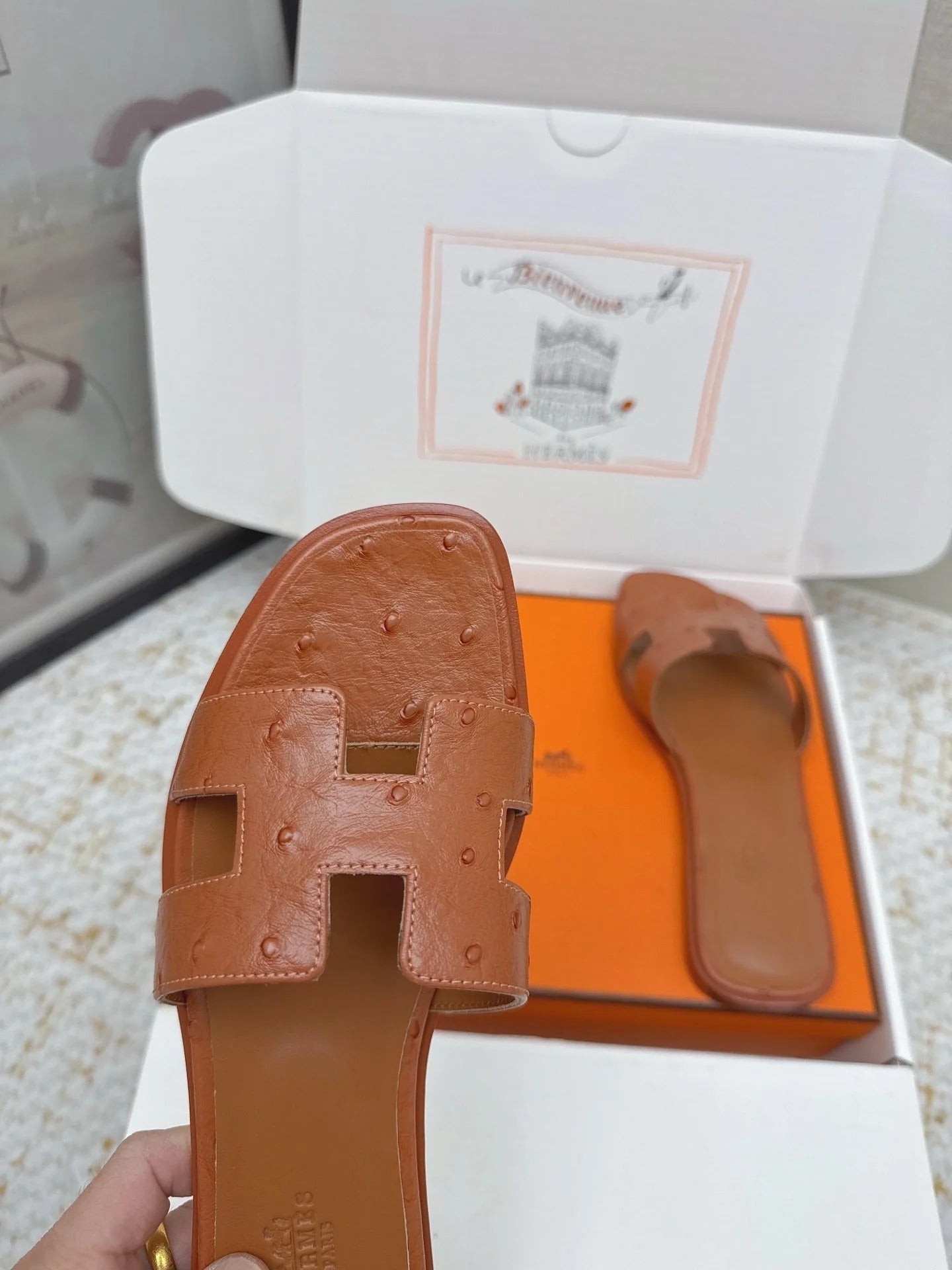 HM 26ss Oran Sandals Brown Ostrich Leather 625092