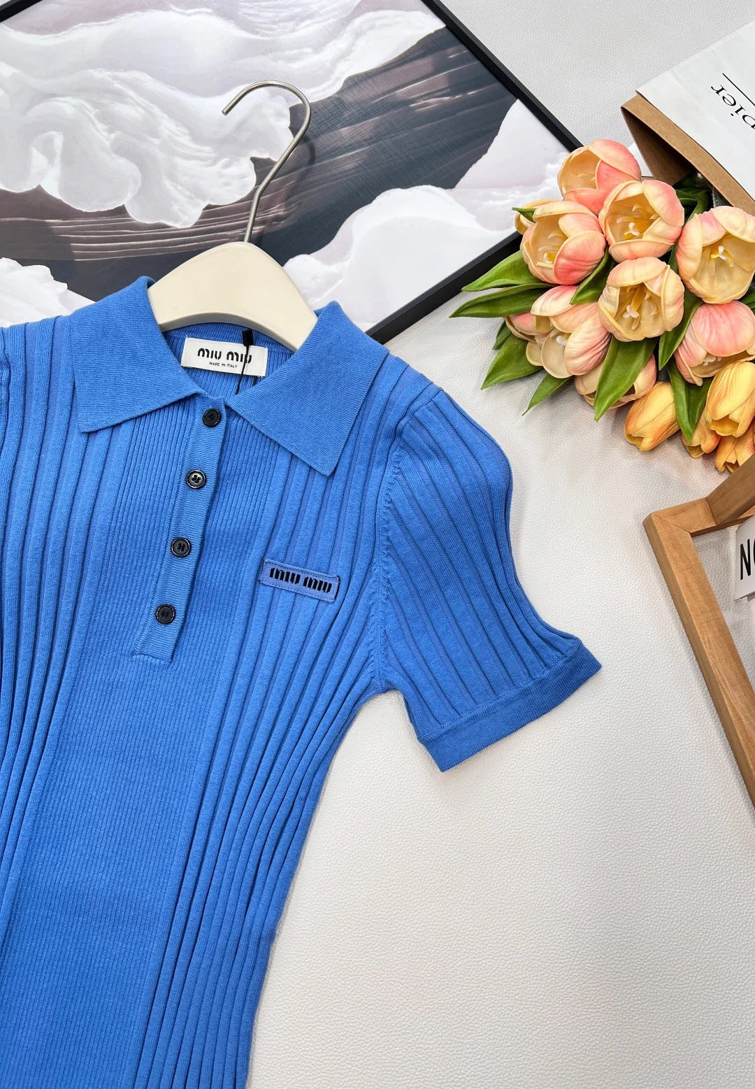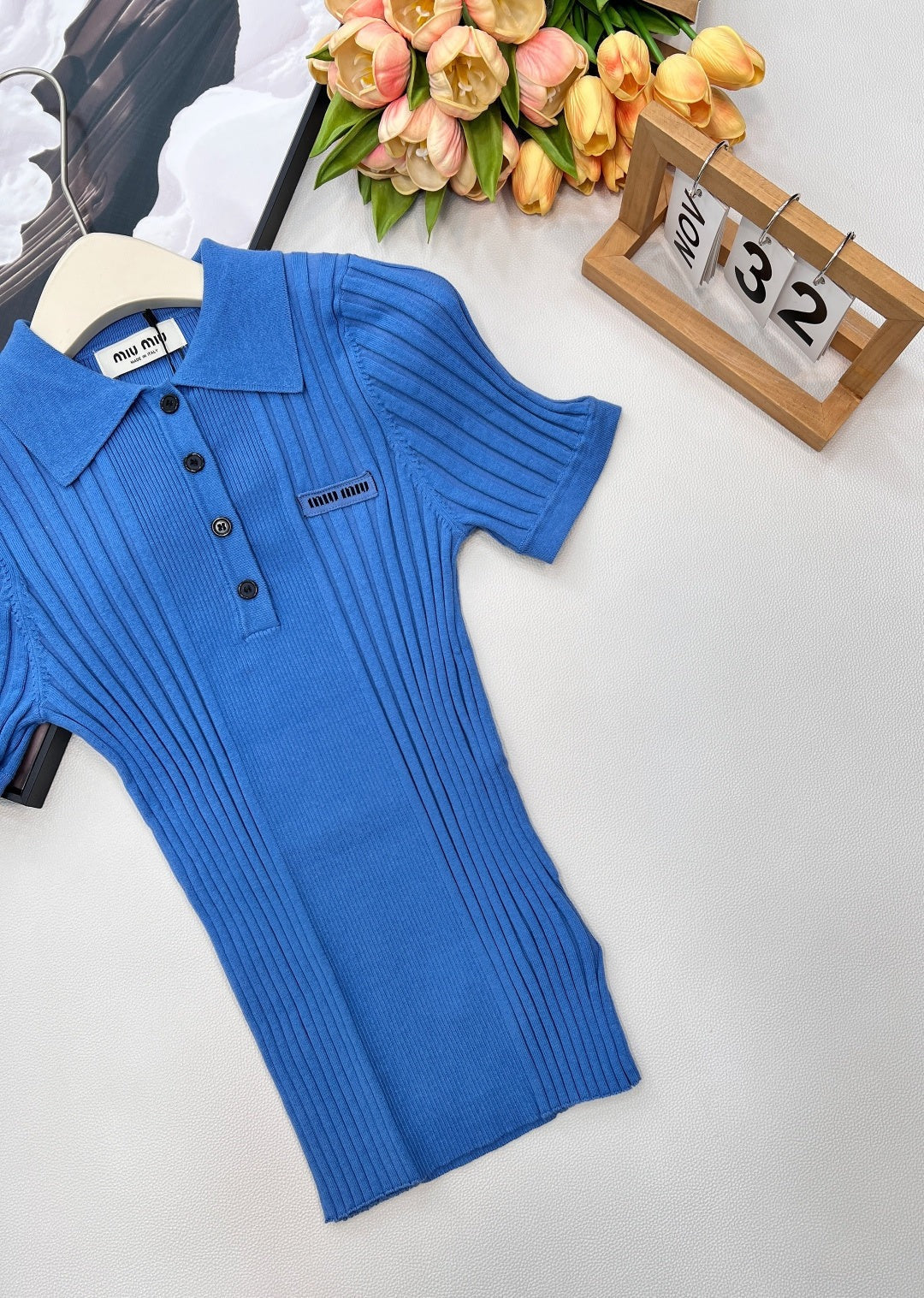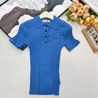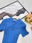 Miumiu 2026 Collared Logo Short-Sleeve Knit Top Blue Cotton