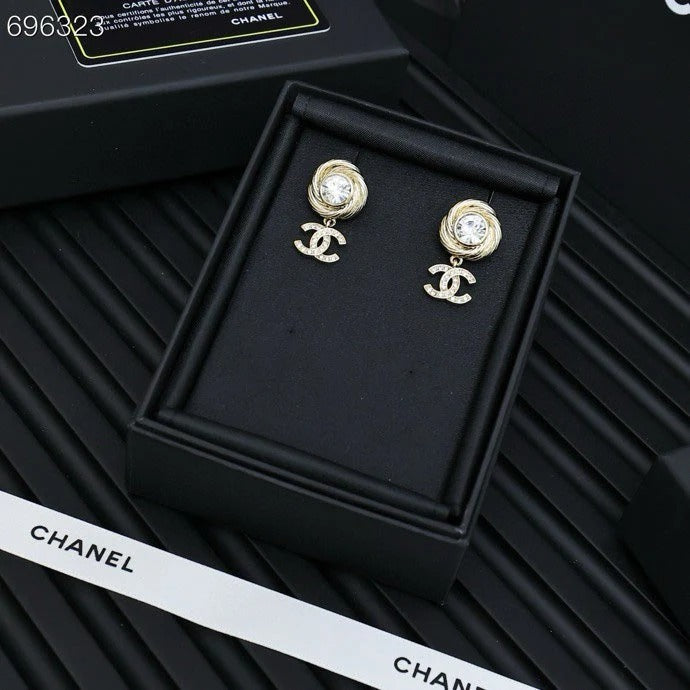 PENDANT EARRINGS IN GOLD METAL WHITE CRYSTAL TWISTED RIBBED DOUBLE C