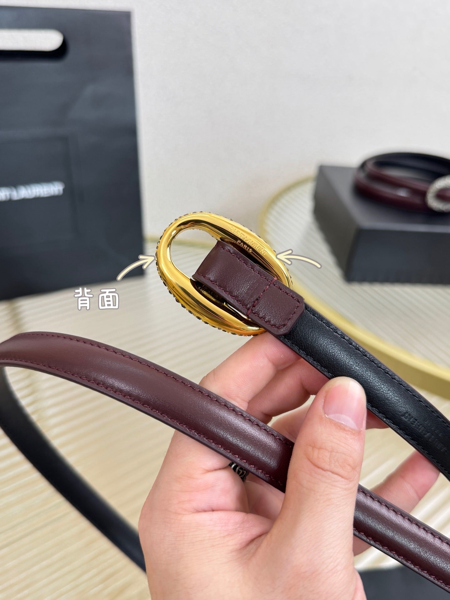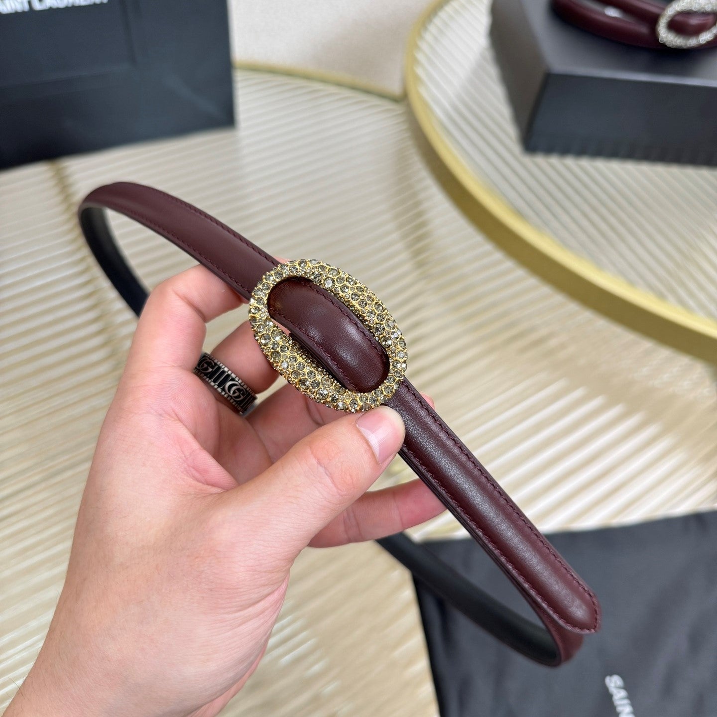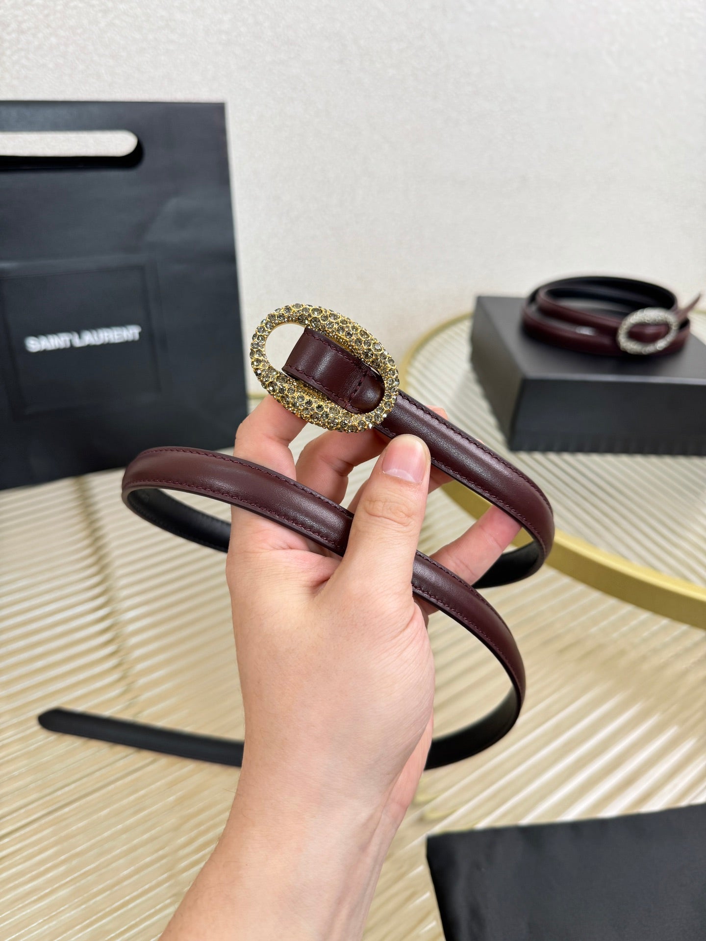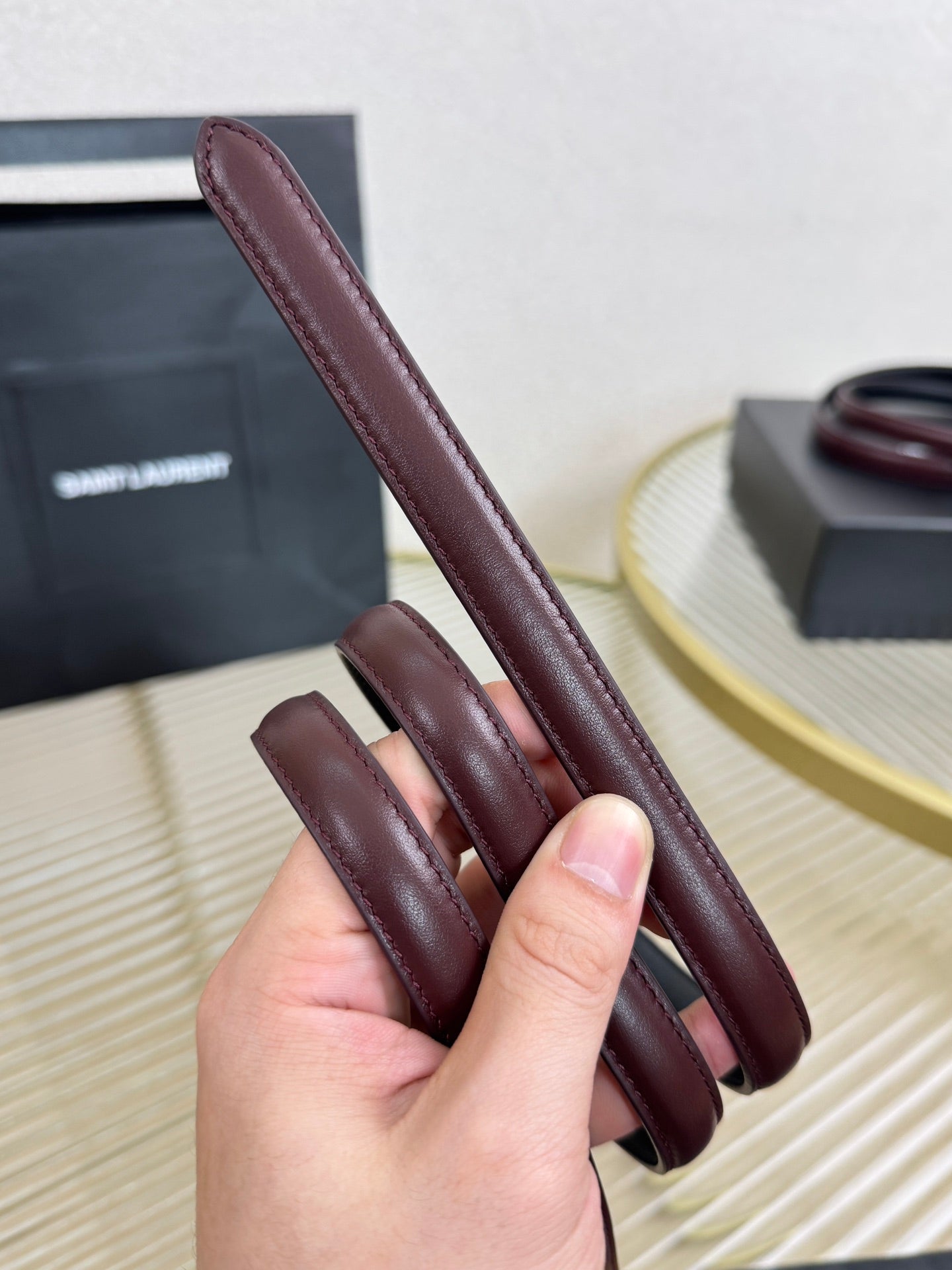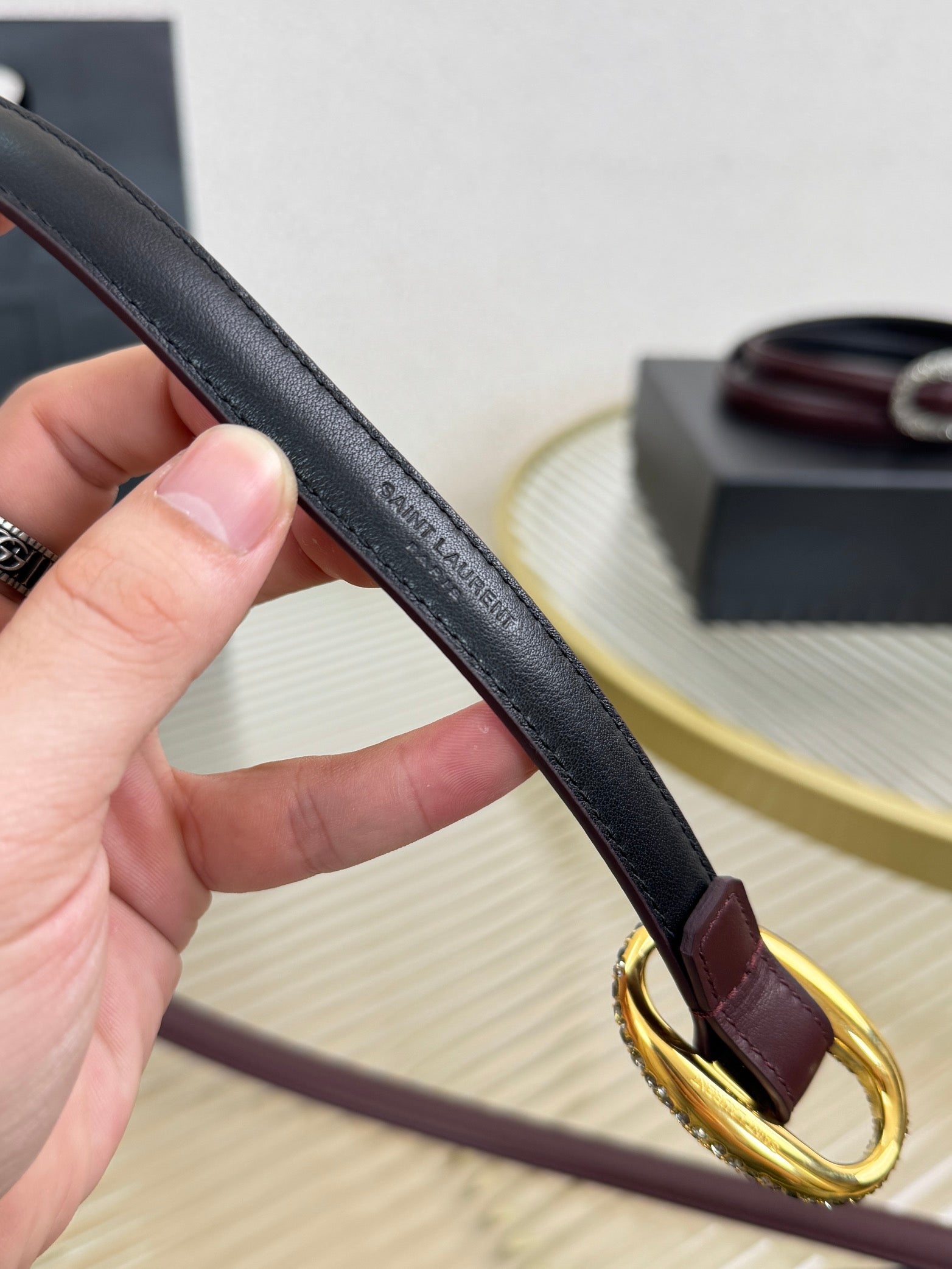 YSL 1.5 Gold Oval Buckle Belt Burgundy Leather
