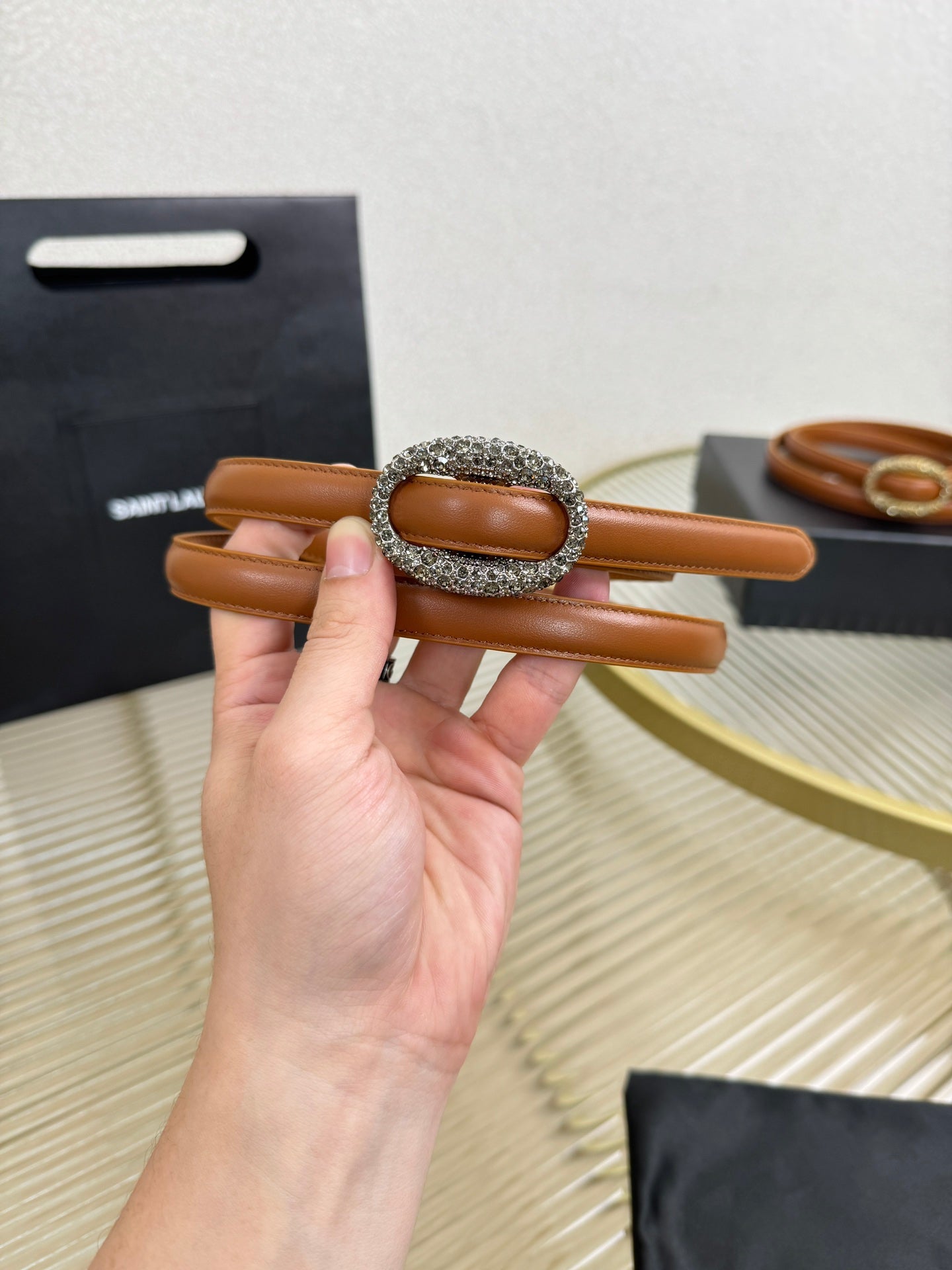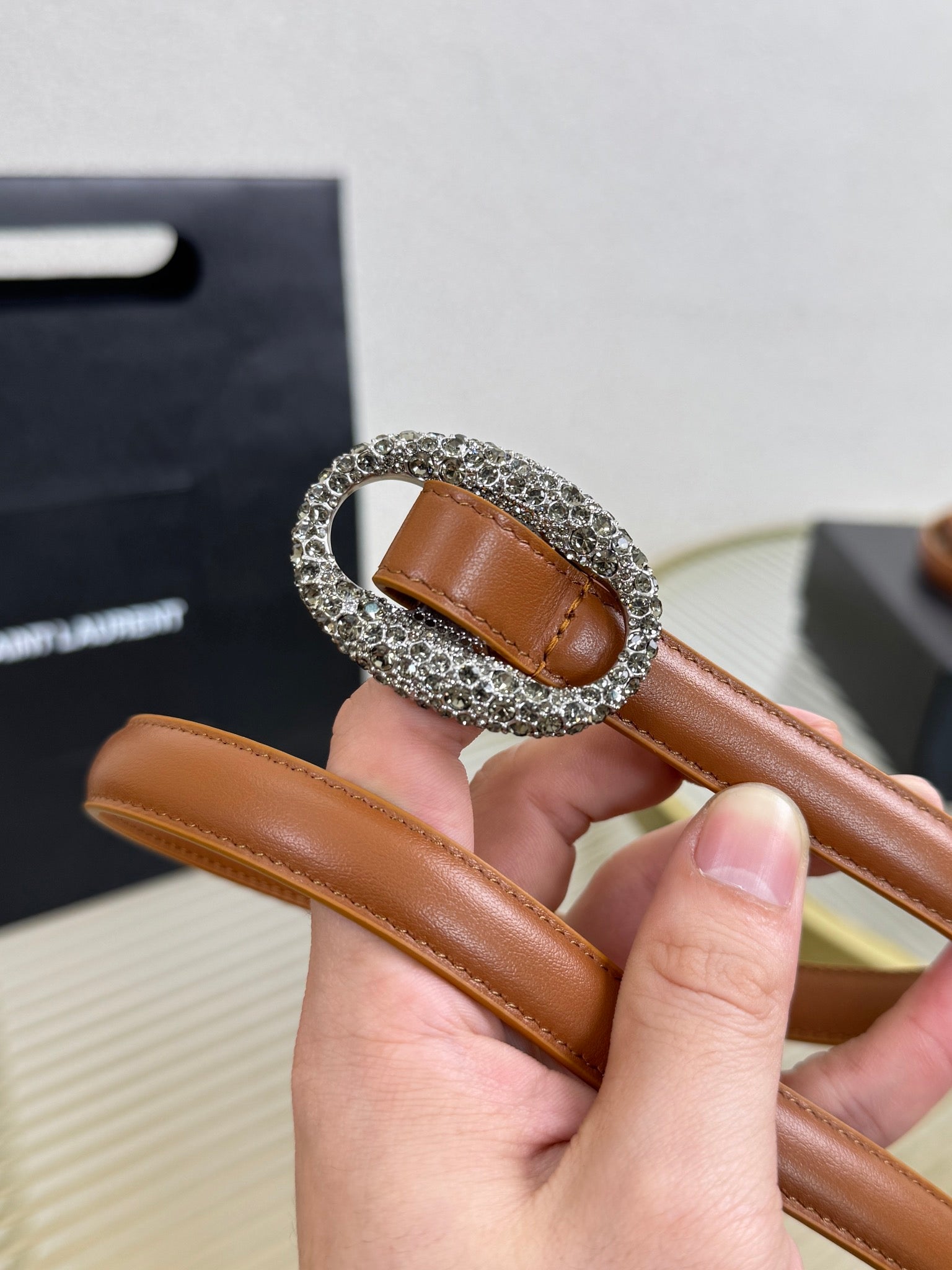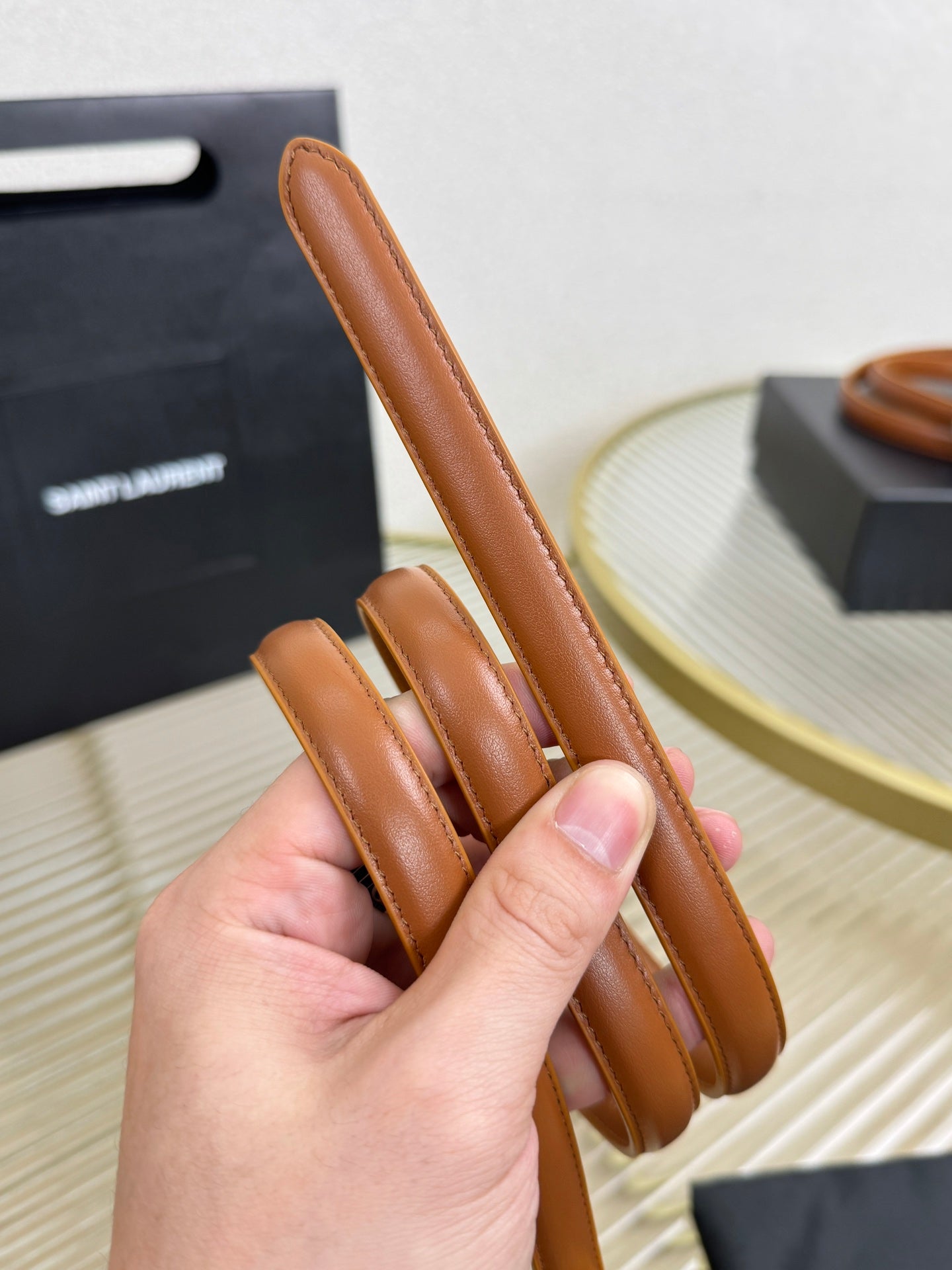 YSL 1.5 Sliver Oval Buckle Belt Brown Leather 200480