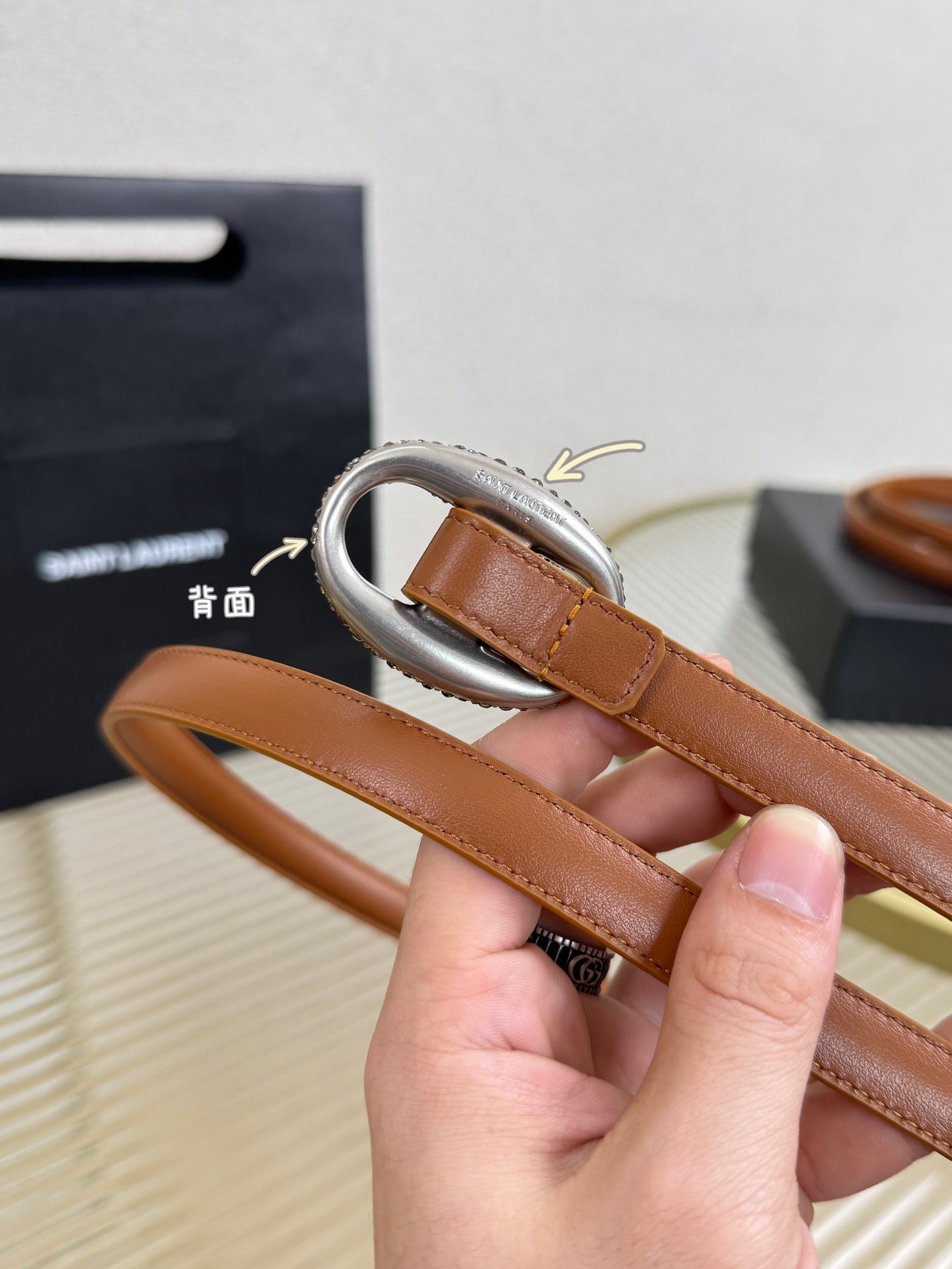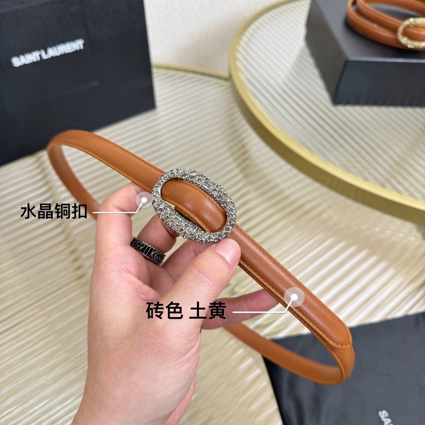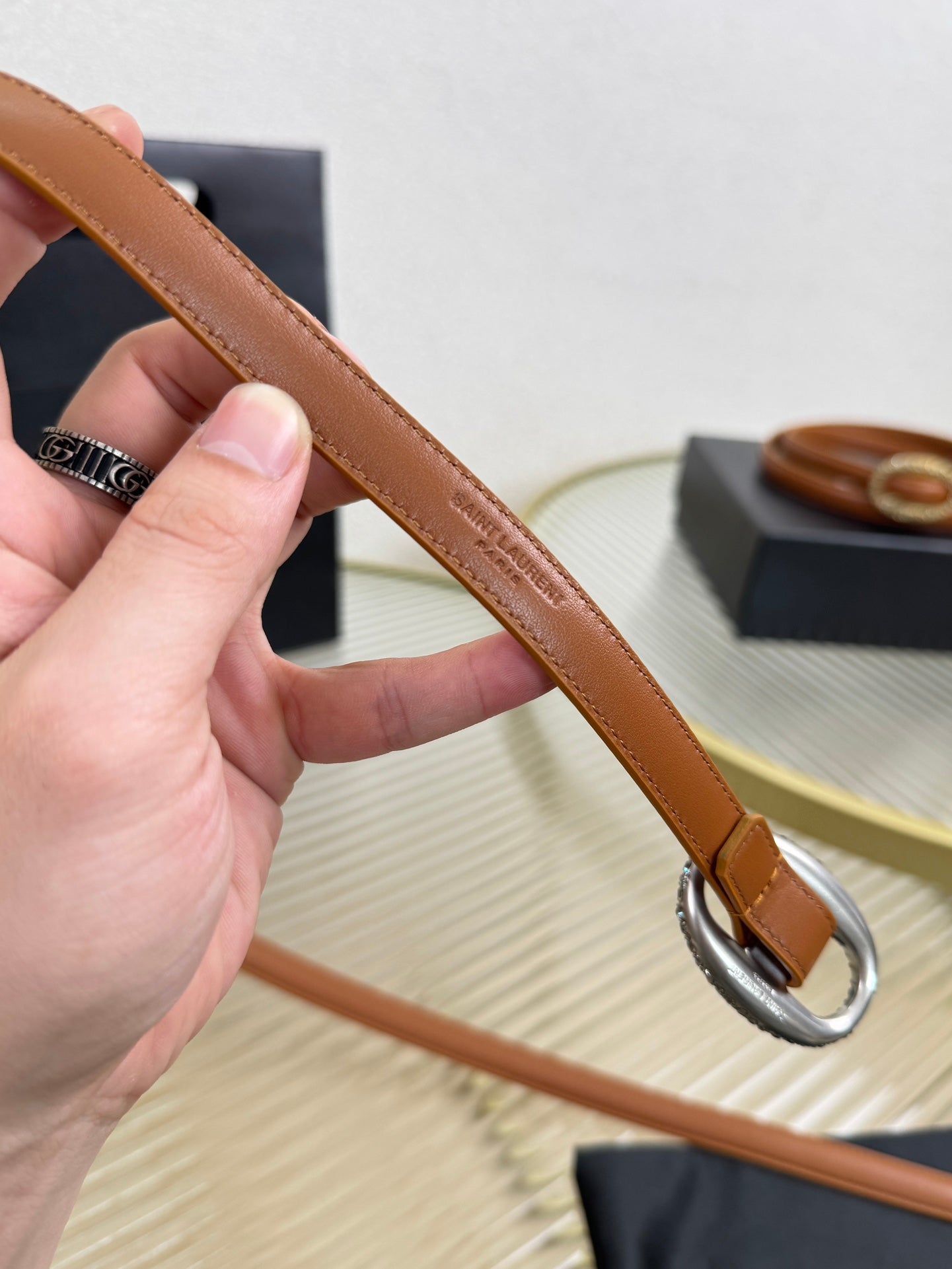 YSL 1.5 Sliver Oval Buckle Belt Brown Leather 200480