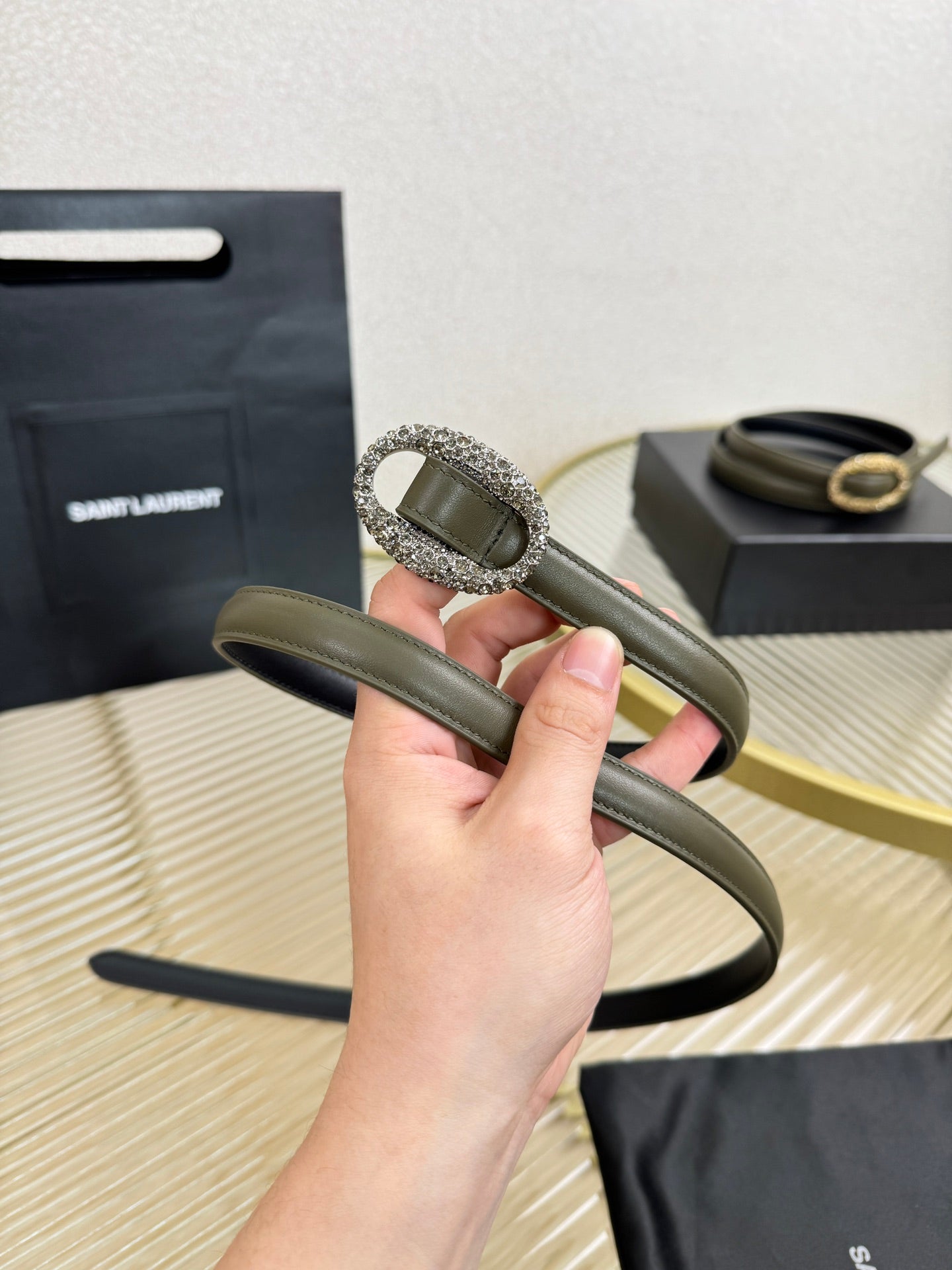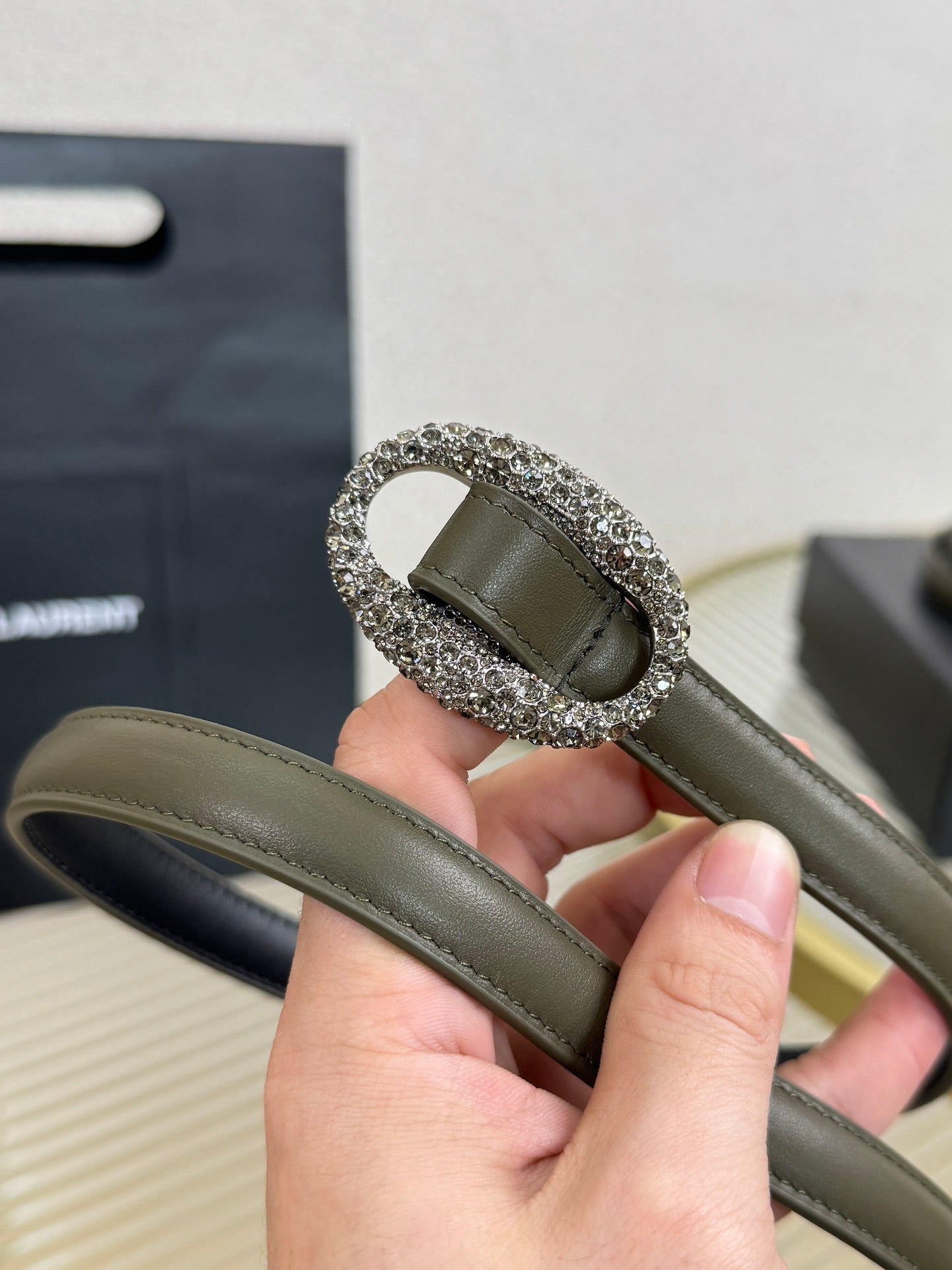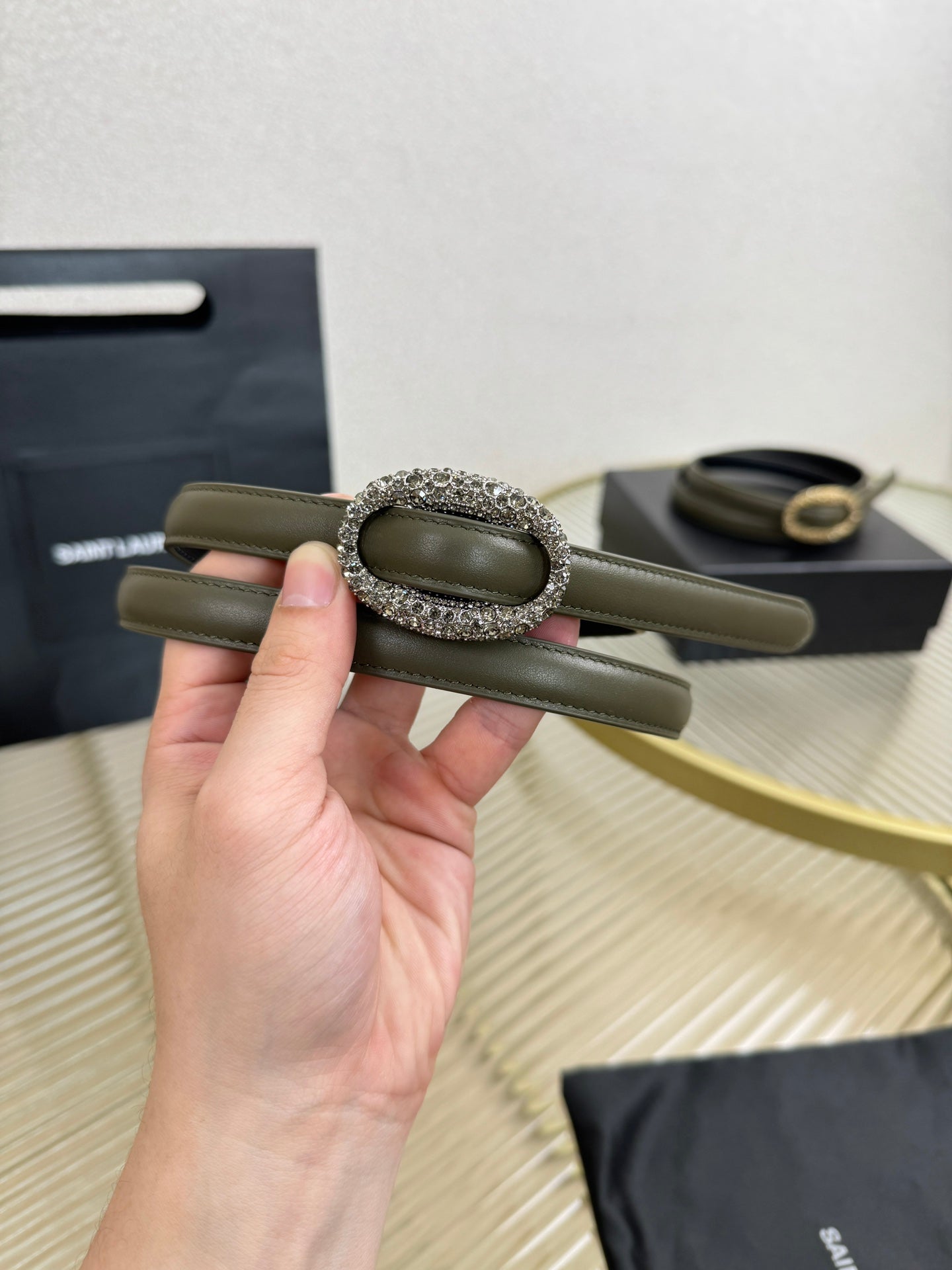 YSL 1.5 Sliver Oval Buckle Belt Olive Green Leather 200478