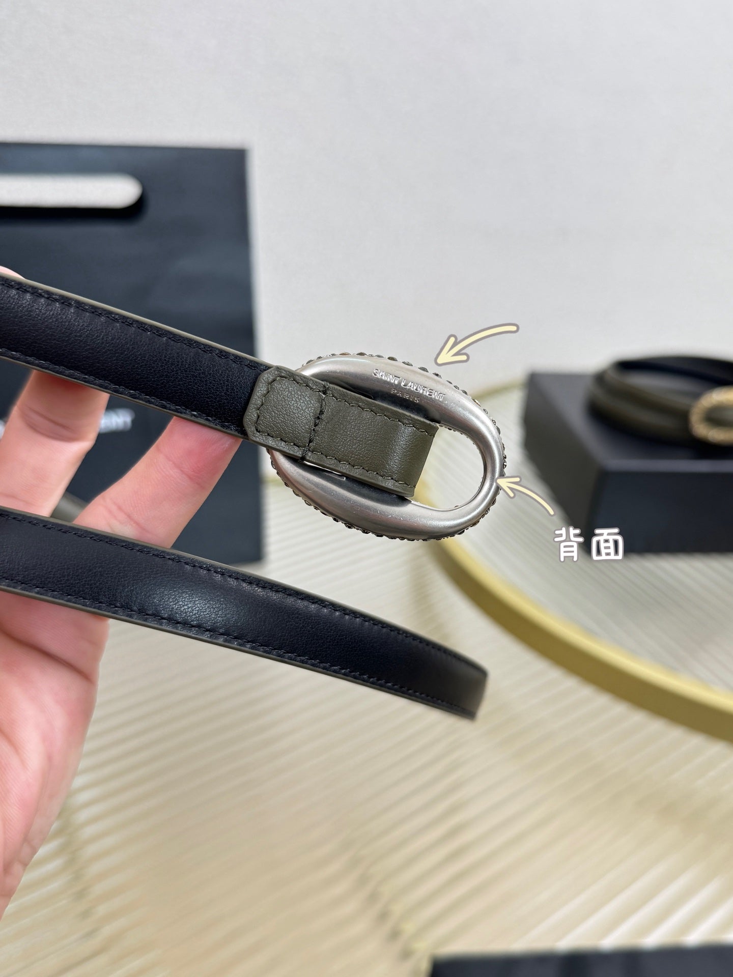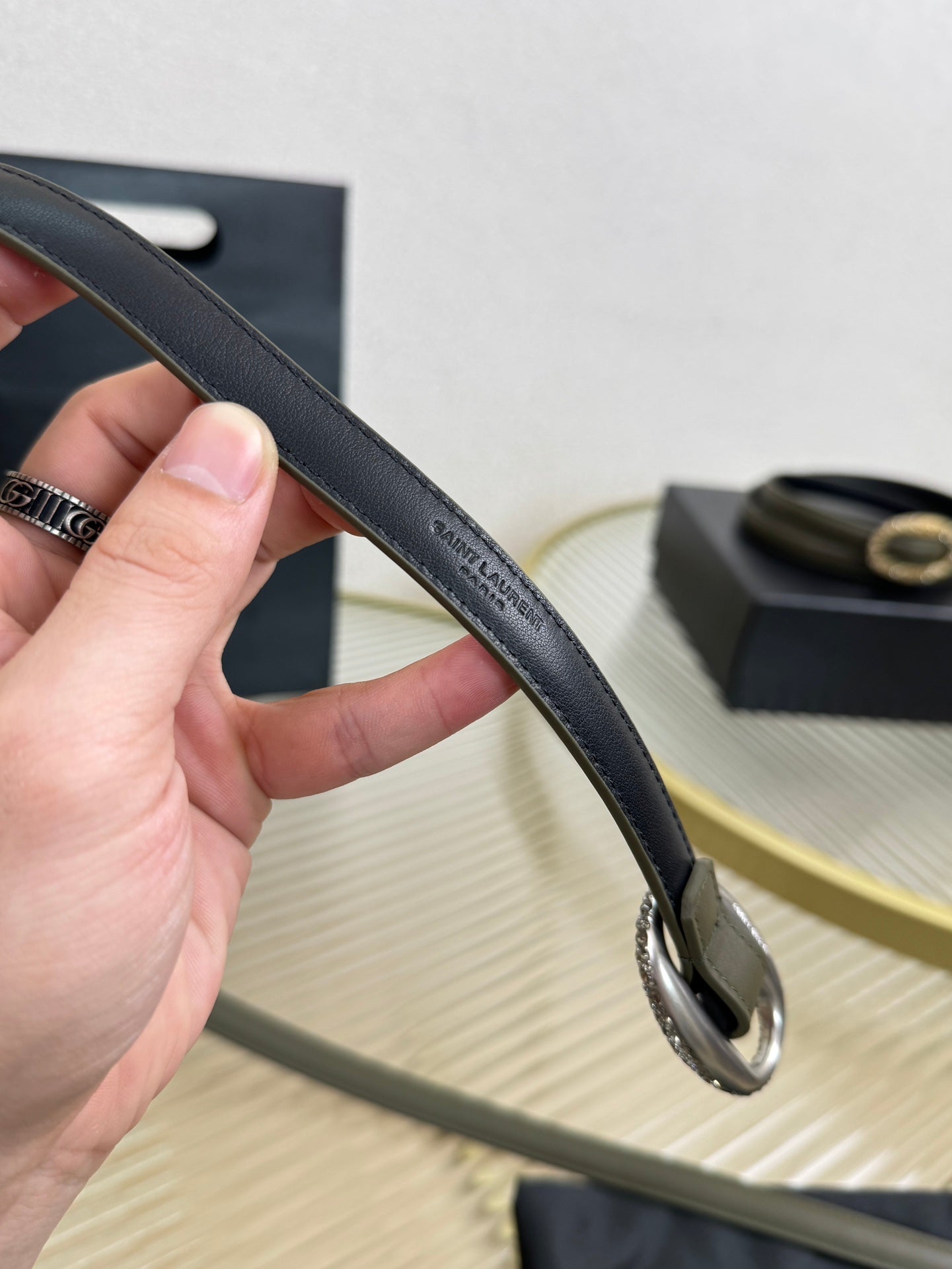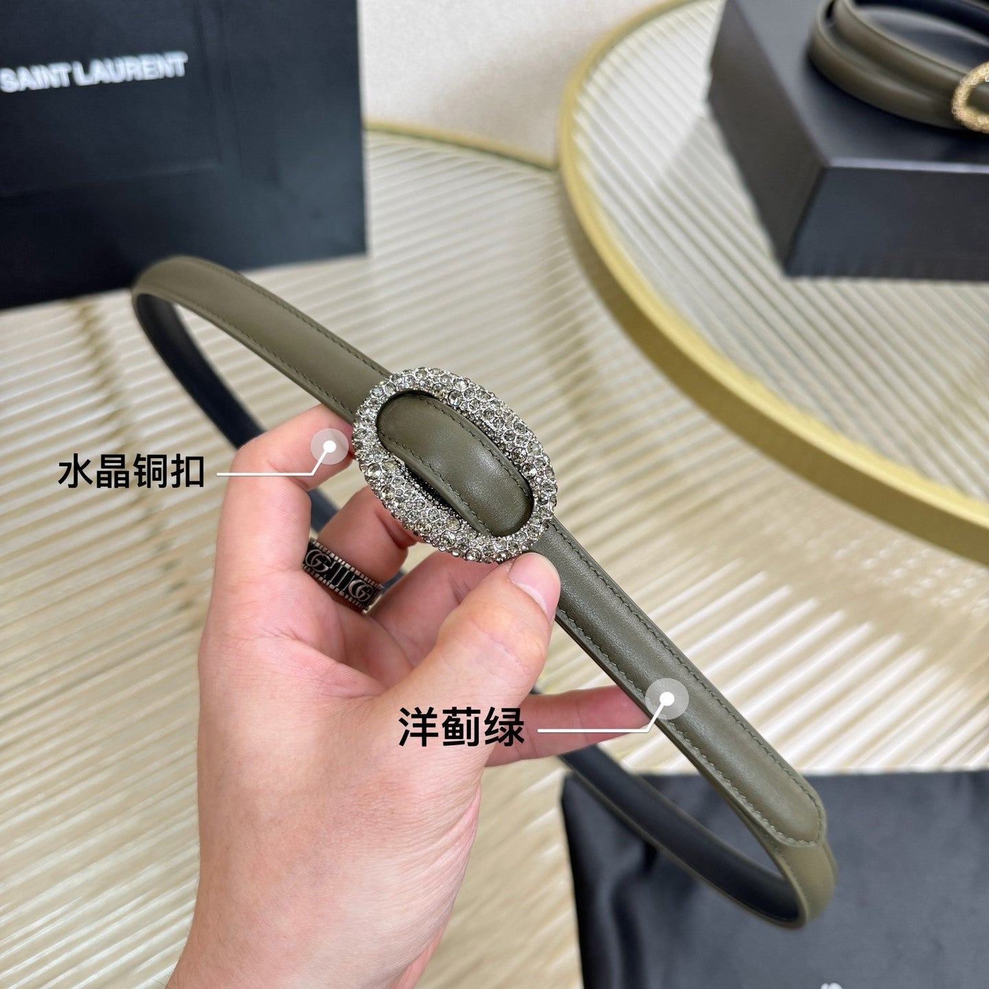 YSL 1.5 Sliver Oval Buckle Belt Olive Green Leather 200478